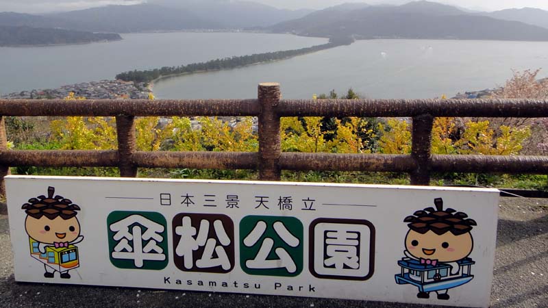 【傘松公園展望台】位於成相山山腰上,是可將天橋立周邊美景盡收眼底的最佳地點,站在著名的「胯間展望台」灣下腰由兩腿之間看出去,讓天幕與海面顛倒過來,天橋立彷彿是一條在空中騰雲駕霧的飛龍,又像是一座從天而降的一字橋,您可以讓想像力自由奔馳,靜心觀察大自然優美絕妙的巧奪天工。