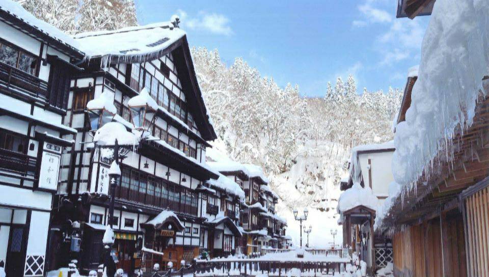 【銀山溫泉老街】銀山溫泉街是在江戶時代因採銀礦而繁榮的溫泉街。轟動一時的NHK電視連續劇「阿信」就是以這裡的「能登屋」為場景。佇立在銀山川兩岸,大正時代的木造建築物櫛比鱗次。「遵照街坊保存條例,其景觀依然存留大正時期的情景」三層、四層重疊之屋簷瓦片訴說著銀山的悠久歷史;越過白銀橋,熱騰騰的煙霧沿著石子散步道旁緩緩上升,坐在特製的長椅上,雙足浸泡在溫泉裡,一邊眺望風景一邊閒聊,別有一番情趣。